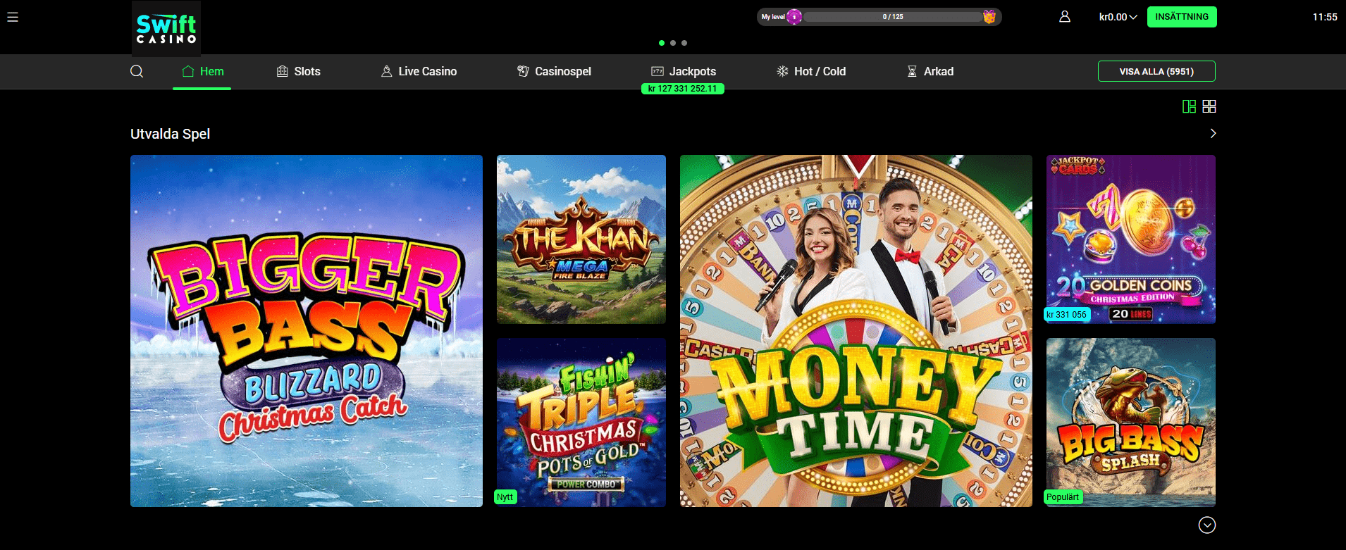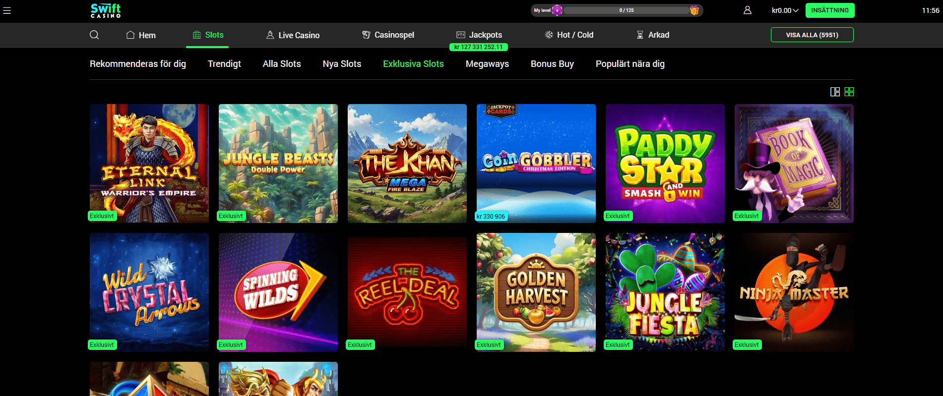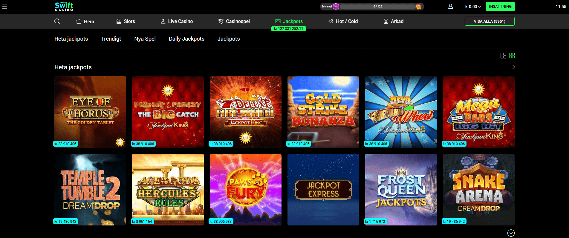 Swift Casino är ett snabbt desktop och mobilcasino där fokus ligger på en smidig mobilupplevelse och minst sagt massivt spelutbud. Totalt finns över 5900 spel och majoriteten är slots från välkända studios som Play’n GO, Pragmatic Play och NetEnt.  I casinolobbyn hittar du även en egen kategori för jackpottspel samt ett live casino som drivs av både Evolution och Pragmatic Play Live.