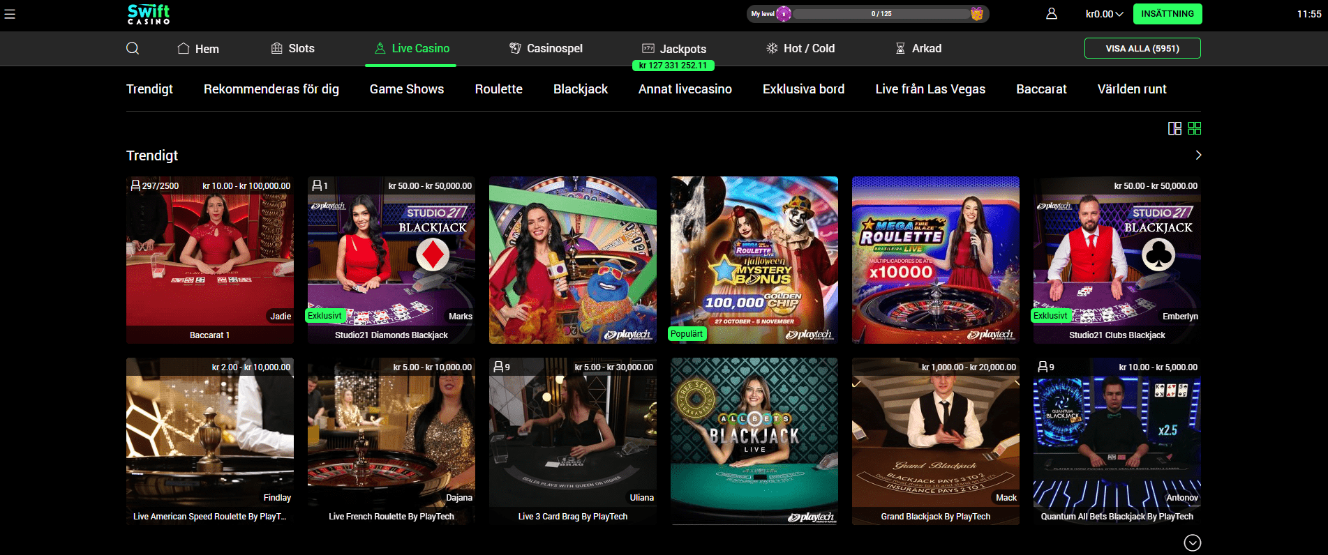 Det finns ett bra blandat utbud av roulette, blackjack, game shows och andra livespel så om du gillar känslan av att spela på ett riktigt landbaserat casino kan det inte slå fel med Swift.